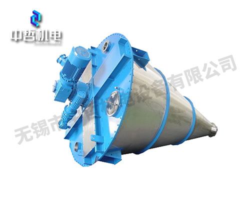 双螺旋锥形混合机的搅拌部件为两条不对称悬臂螺旋,长短各一,它们在绕自己的轴线转动(自转)的同时,还环绕锥形容器的中心轴;借助转臂的回转在锥体壁面附近又作行星动(公转);该设备通过螺旋的公、自转使物料反复提升,在锥体内产生剪切、对流、扩散等复合运动,从而达到混合的目的。产品可根据要求设计外夹套(加热、冷却),喷雾器,广泛应用于化工、医药、农药、染料、建材等粉体与粉体的混合、反应。 该机根据工艺要求可在混合机筒体外增加夹套,通过向夹套内注入冷热介质来实现对物料的冷却或加热;冷却一般泵入工业用水,加热可通入蒸汽或电加热导热油。